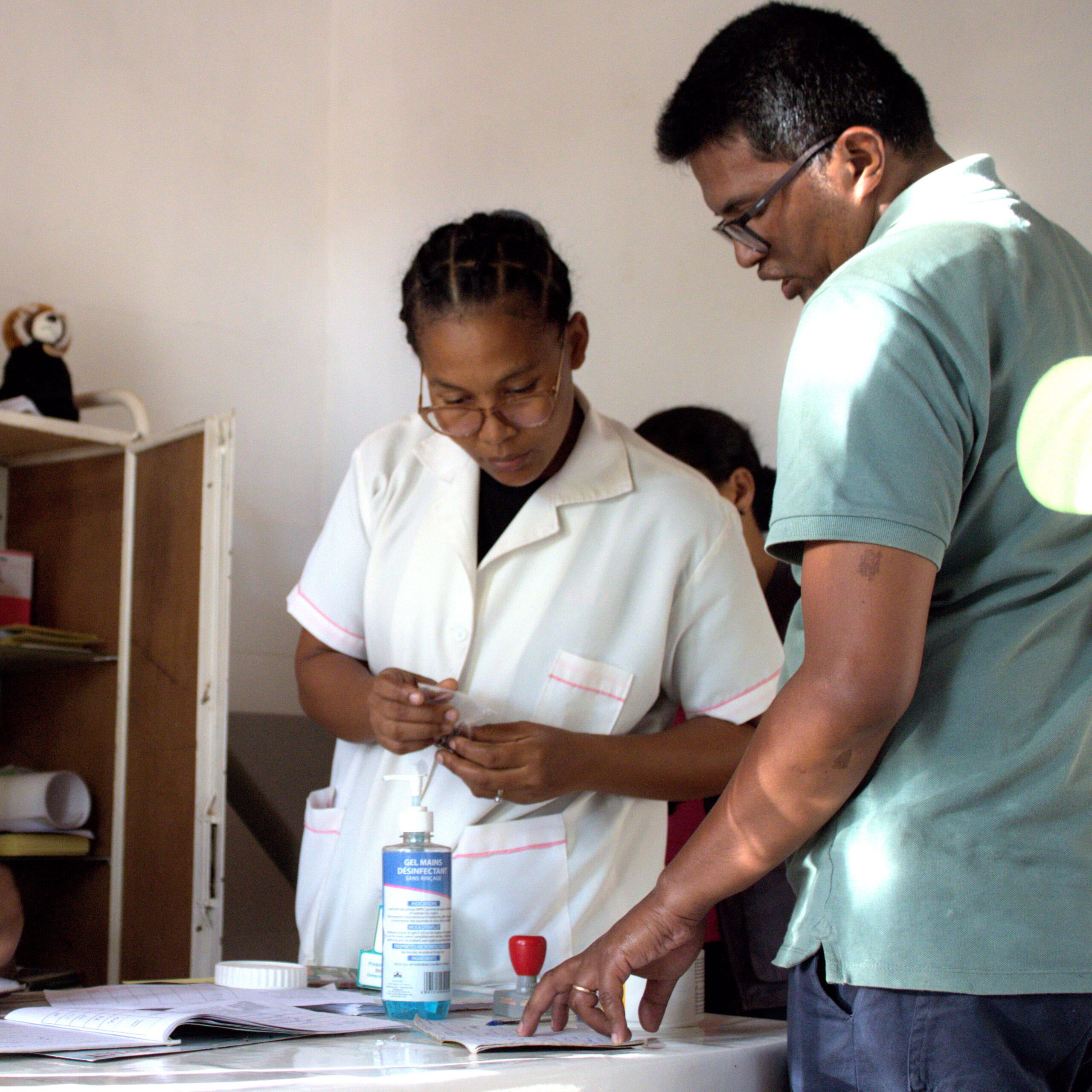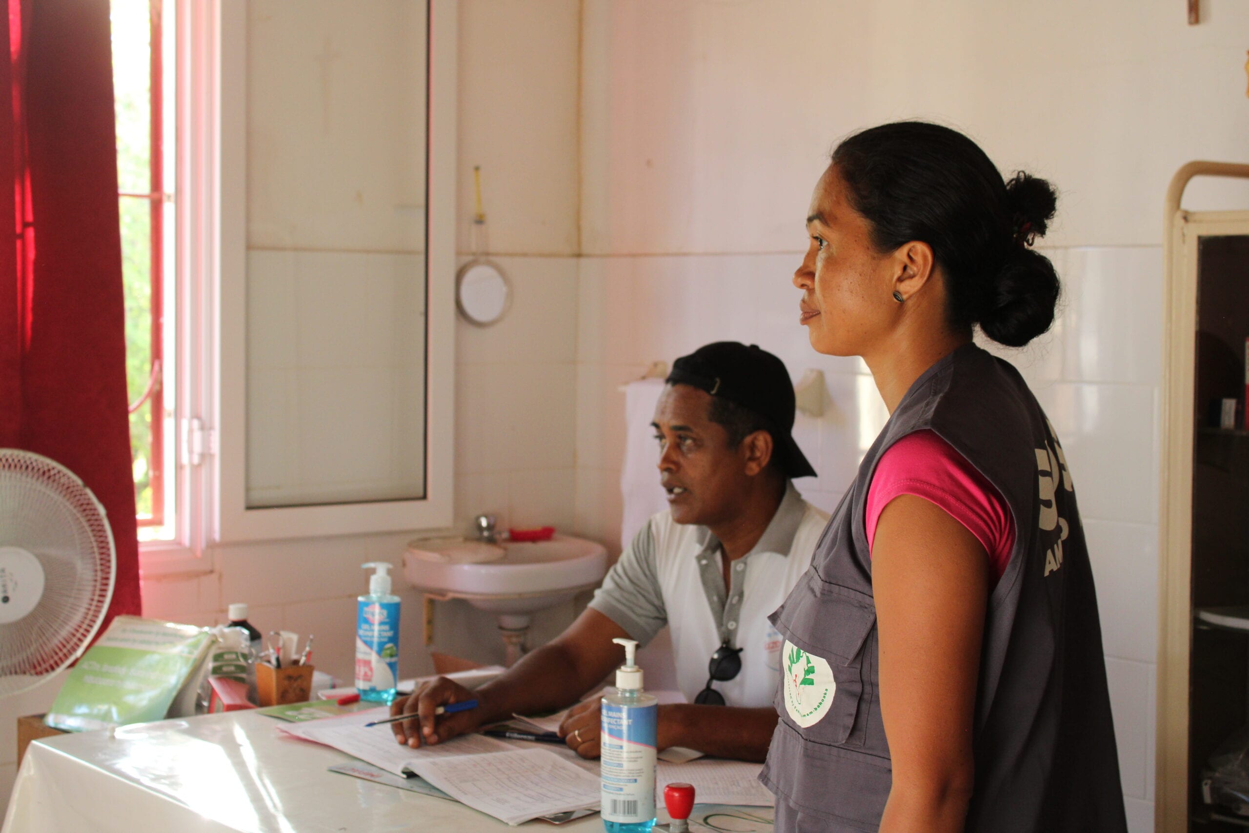 Le coordonateur du Programme national de lutte contre la lèpre, Dr Dr ANDRIANIRIANA Mbolamanana, supervise le travail de Mme Jenny Ainjak, lors d’une visite dans le district. ©Marie-Capucine Gaitte