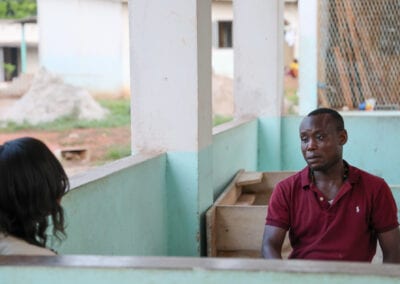 Les hospitalisations de longue durée entraînent une rupture de la vie sociale des malades : au village, leur absence représente une perte économique pour les familles qui s’habituent à vivre sans eux. Les malades perdent le sens de leur utilité et de leur appartenance à une communauté. Certains demeurent alors aux abords des centres de traitement. C’est le cas de Bonnaventure A., un homme hospitalisé depuis 8 ans en raison d’aggravations d’un ulcère de Buruli : « j’ai perdu ma jeunesse, je n’ai pas vécu ce que je voulais » exprime-t-il le regard brillant, « mais la sœur Tano m’a écouté, et elle a su toucher le point douloureux de ma vie… je m’apitoyais sur moi-même, les séances sur l’estime de soi qu’elle a faites avec nous m’ont permis de me relever. Je veux lui dire merci. »