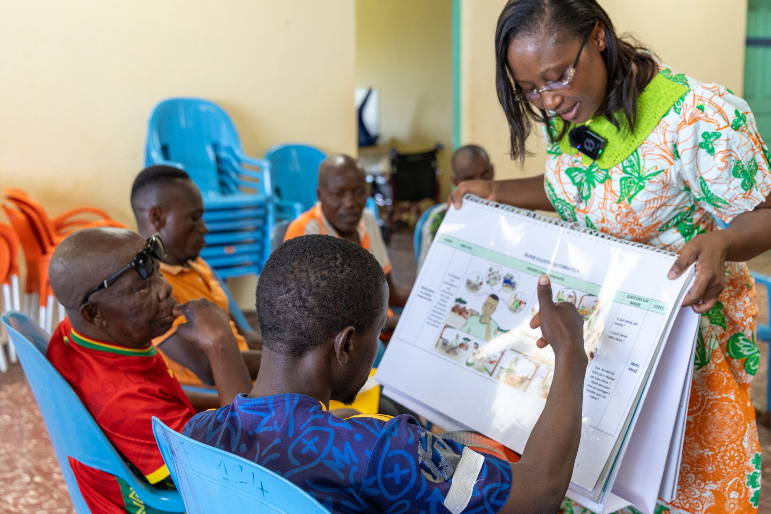 Lors des ateliers, ici à Adzopé, Sr Tano Akoua utilise des images pour sensibiliser les patients à l’estime de soi. ©Marie-CapucineGaitte