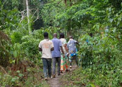La forêt tropicale frémit alentour. À travers les plants de palmiers et d’hévéas, se dresse un campement : une case en longueur que précède un vaste poulailler coiffé d’une bâche noire. Un travailleur s’avance pour accueillir un homme âgé au pas bancal suivi d’une femme au large sourire. L’ancien, Simplice N., rend visite à son neveu qui a lancé, quelques mois auparavant avec l’aide de la Fondation Raoul Follereau, une ferme avicole pour le compte de son oncle. Grâce aux revenus de la ferme, Simplice N. a pu rentrer dignement au village, après une vie passée à l’Institut Raoul Follereau d’Adzopé.