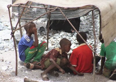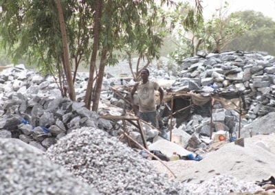 Au sein de carrière, entre les tas de granit, des abris s’égrènent le long du sentier qui mène au trou. Quatre maigres bout de bois et une bâche usée offrent un peu d’ombre aux concasseurs. Le peu de vent qui souffle laisse entrevoir des enfants, burin à la main, assis sous ces abris. Ils concassent la pierre à côté de leur mère. Les enfants sont les plus fragiles et développent des maladies pulmonaires telles que l’asthme. Plusieurs fois par jour, ils font des allers-retours pieds nus entre le trou et la surface, sur des sentiers raides, zigzagant entre les tas de ferrailles rouillées issus des pneus brûlés. La pluie est aussi l’un des dangers. « Il arrive que des enfants se noient quand le trou se rempli d’eau lors de la saison des pluies », explique Claude-François Ouedraogo, « les gens se cotisent pour extraire l’eau mais cela n’empêche pas les accidents. »