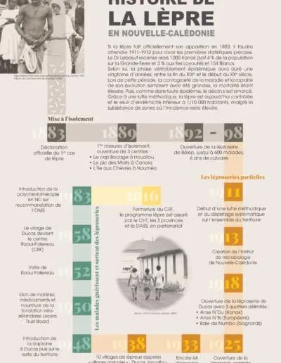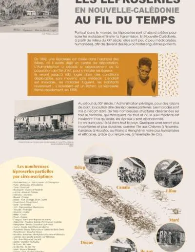 En Nouvelle-Calédonie, les premiers malades de la lèpre sont déclarés en 1883. En l’absence de traitement, des mesures d’isolement sont alors prises et les malades reclus dans des centres. Après l’échec d’une léproserie centrale à Bélep dans les années 1890, le choix est fait de développer des léproseries partielles, à l’écart des lieux de vie. L’archipel a compté jusqu’à 64 léproseries réparties sur tout le territoire.