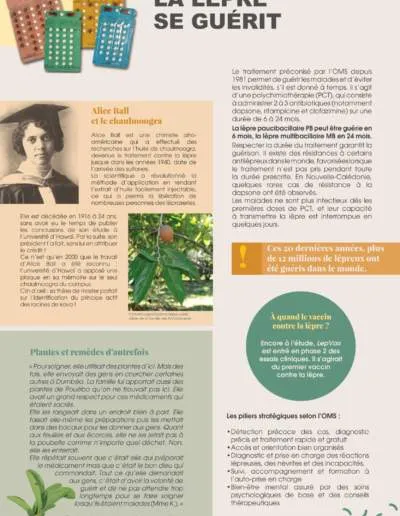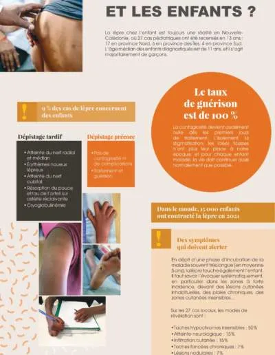 La lèpre sévit aussi dans des territoires français. En Nouvelle-Calédonie, trois à dix nouveaux malades sont dépistés chaque année. Face à ce constat, le gouvernement de la Nouvelle-Calédonie développe une stratégie d’élimination de la lèpre, avec l’appui technique de la Fondation Raoul Follereau. Depuis janvier dernier, une exposition retrace l’histoire de la lèpre et dresse un bilan de la situation. Elle vise notamment à indiquer au grand public qu’un dépistage précoce permet une guérison complète et sans séquelles.