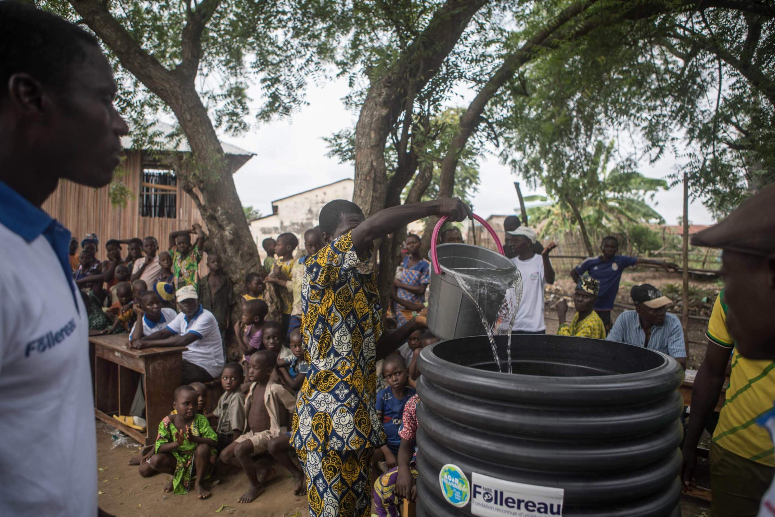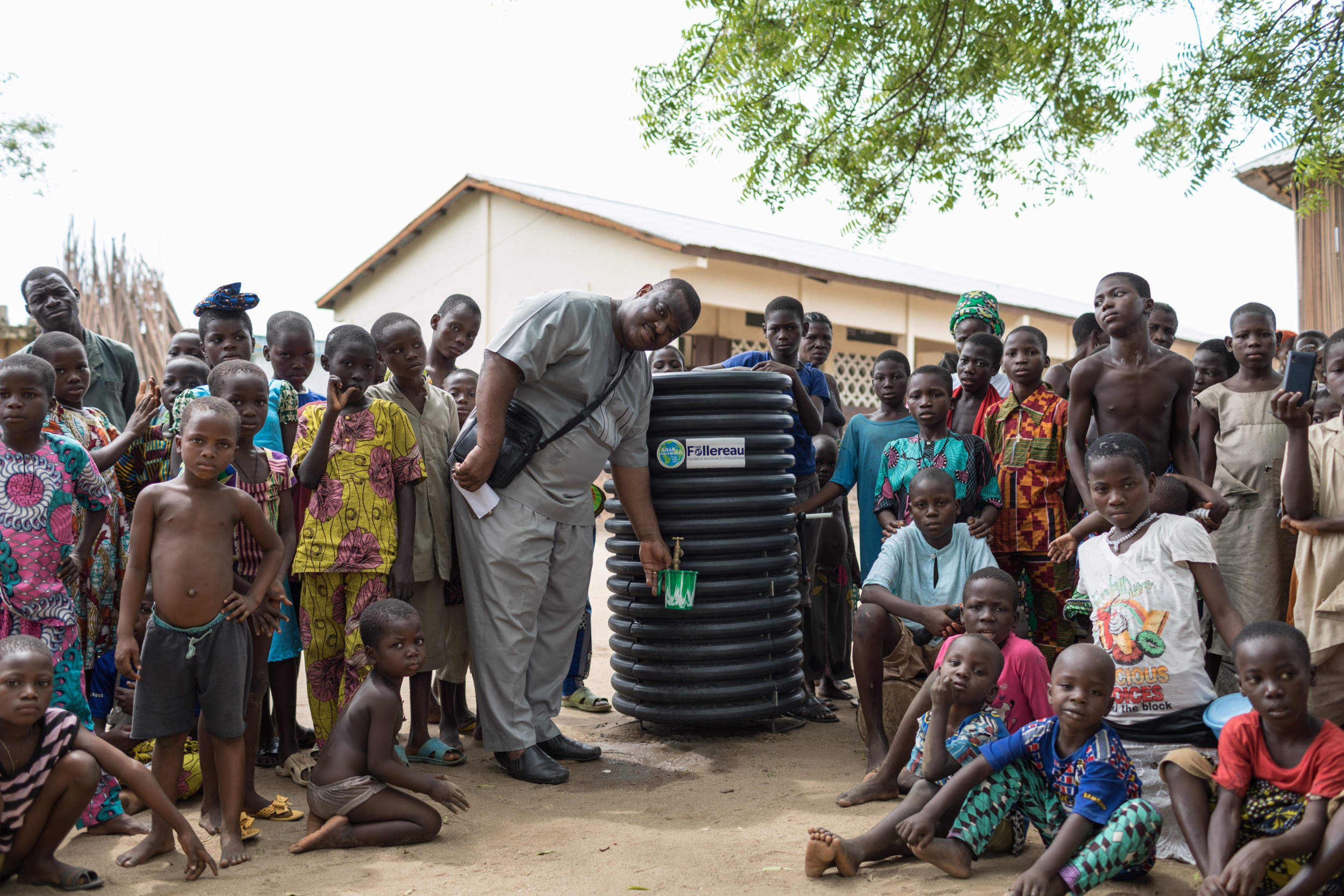 Dans le village, c’est l’effervescence. Une grosse citerne noire trône sur la place publique. Jean-Claude Augereau, président de l’association Agir Ensemble, a fait le déplacement jusqu’au Bénin pour inaugurer ses machines. Appelées Safe Cube Water, elles permettent de filtrer l’eau pour la rendre potable. Tel un grand cru millésimé, l’eau est tirée des cuves avec soin. Trouble et grise avant le filtrage, elle ressort d’une limpidité étonnante. Les enfants ont l’honneur de boire le tout premier verre d’eau potable de l’île. Avec une capacité de filtrage à 15 000 litres d’eau par mois, ces points d’accès sont une véritable avancée pour le village. Il en existe deux à présent, un près du château d’eau, dans le village, et un dans l’école.