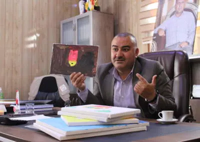 Kawa Eido Khattari, le directeur de l’orphelinat, montre le dessin d’un enfant très perturbé. © Marie-Charlotte Noulens
