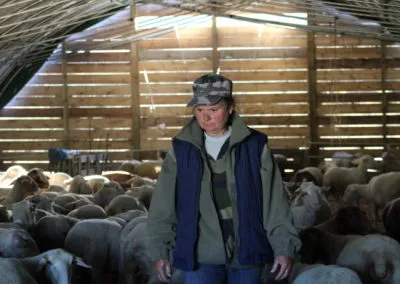 « Sans la PAC, il n’y aurait pas d’éleveurs », affirme dans une colère sourde Robert. Pour être rentable Véronique doit vendre 200 agneaux, en plus de percevoir cette subvention européenne. A ce jour, elle en vend en moyenne 70 par an. Sans compter les multiples charges : vétérinaire, transport pour l’estive, foin, granulés pour les agneaux, location des terrains… Sous ses apparences sauvages, chaque parcelle de montagne appartient à quelqu’un. Des ruines d’anciennes bergeries perlent les flancs de collines. « Toutes ces terres étaient jadis des prés que nos anciens fauchaient. On est les deux seuls fous qui revenons sur la terre de nos ancêtres », souligne Robert en baissant la voix. Dans les prés laissés à l’abandon par des générations d’hommes partis tenter leur chance en ville, Véronique savoure la solitude. « Je peux rester une heure, assise sur un rocher, à regarder mes brebis paître. Cette posture aiguise les sens notamment l’ouïe ! » Sa chapka et ses lunettes de soleil donnent à Véronique des airs d’exilée de Sibérie.