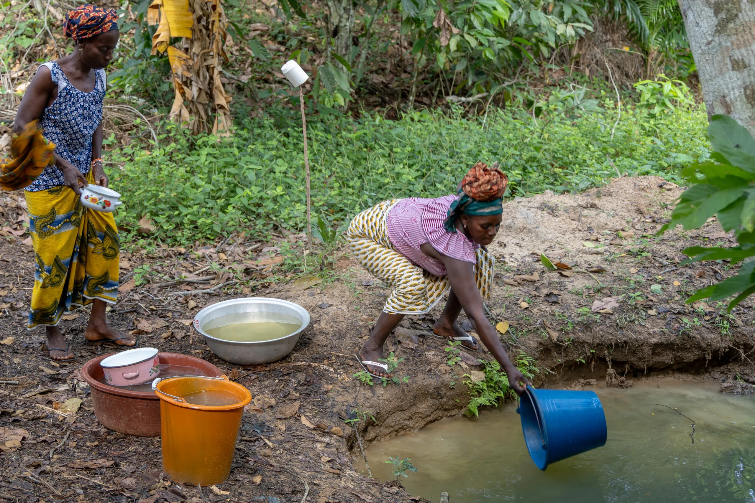 « Avant l’arrivée de la pompe au village, il fallait nous lever à 4h pour chercher l’eau ici, et le soir au retour des champs, on y revenait » partagent deux femmes au bord d’un marigot distant de 6 km de leur village Gadago, dans le district de Soubré. À leurs pieds, l’eau jaunâtre forme une mare – où les femmes des campements voisins viennent encore puiser. Le chef central de la localité rapporte les maladies sévissant lorsque les habitants boivent l’eau des marigots ou des puits non protégés : maladies de peau, bilharziose, diarrhées et choléra.