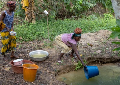 Une fois arrivées au marigot, il leur faut encore filtrer l’eau jaunâtre, comme elles peuvent, avant de puiser. L’eau sera bue et utilisée pour la cuisine. ©MC-Gaitte
