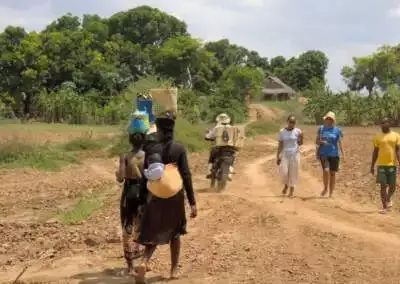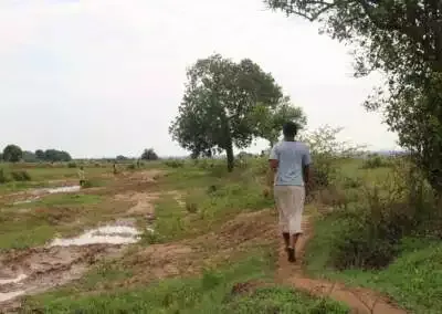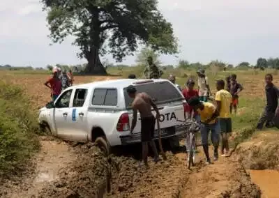 En chemin vers les villages, il faut souvent quitter le véhicule pour traverser les passages obstrués. ©Marie-Capucine Gaitte