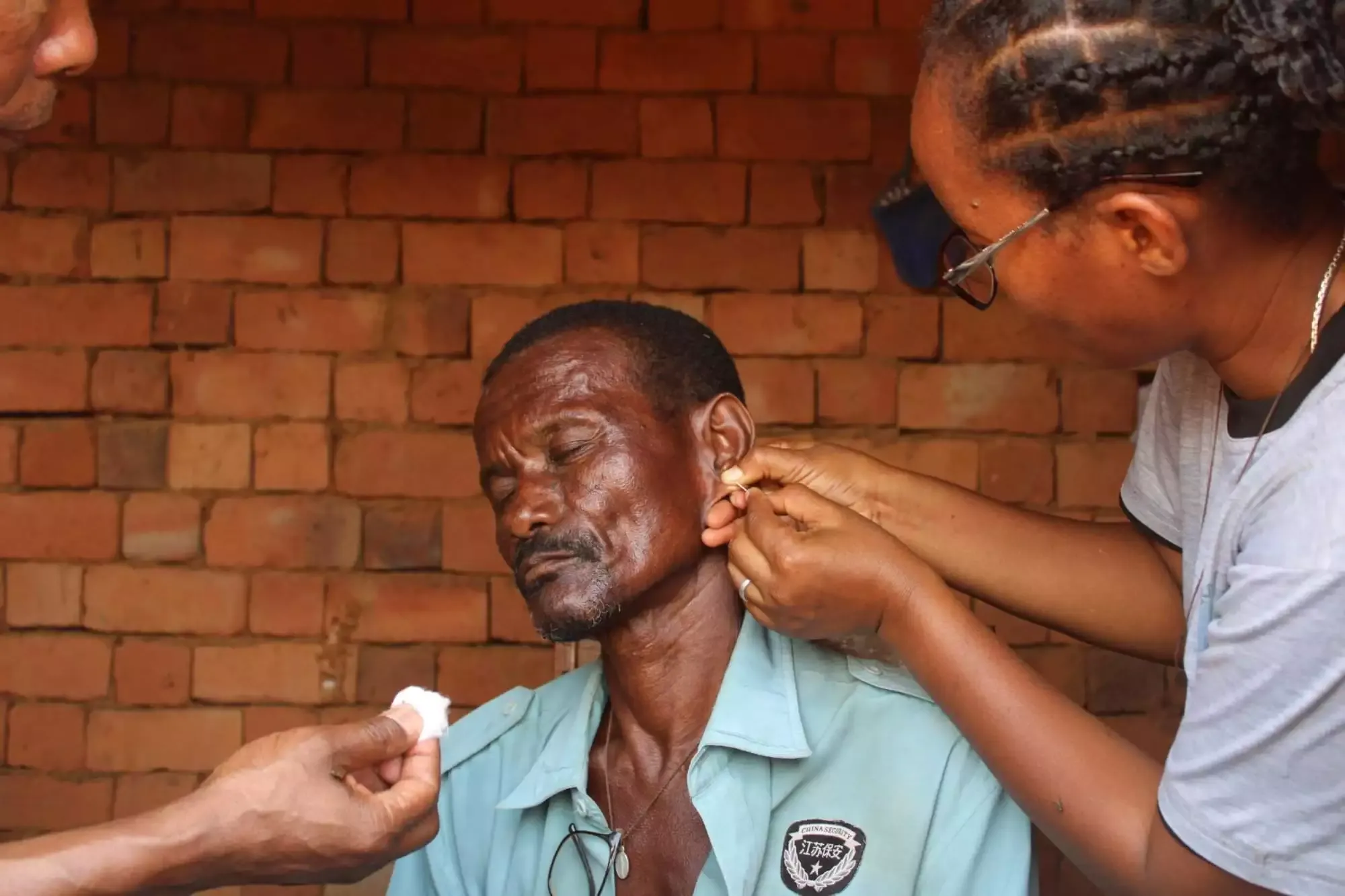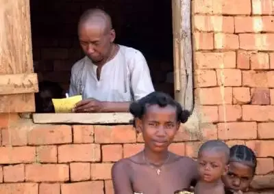 Un groupe d’habitants rassemblés par le chef de village attend les soignants. Ce dernier a rencontré Sœur Mauricia quelques mois auparavant et, sensibilisé par elle à la lèpre, il la tient informée des signes suspects – taches sur la peau, griffes – observés dans sa communauté. La religieuse soignante s’apprête donc, ce matin-là, avec l’aide des deux médecins venus de la capitale, à examiner toutes les personnes présentant des maladies de peau. Le docteur Mbolamanana Andrianiriana, coordinateur du PNL explique l’importance de ces dépistages actifs dans les villages : « Au cours des 10 dernières années, on décompte en moyenne 1500 nouveaux cas de lèpre par an – une cinquantaine pour le district de Port-Bergé. Il nous faut continuer de dépister activement les malades et retrouver ceux perdus de vue pour freiner la transmission. Tout ce travail, nous le faisons main dans la main avec la Fondation Raoul Follereau. » D’abord hésitants, les habitants se présentent un à un aux soignants qui les auscultent, testent leurs réflexes nerveux, leur expliquent la maladie le cas échéant. Un temps de sensibilisation est organisé tandis que Sœur Mauricia et le chef du village partent à moto en quête des absents ayant quitté tôt le village pour le marché hebdomadaire. En fin de matinée, sous un soleil déjà écrasant, tous ceux présentant des dermatoses ont été examinés et quatre nouveaux cas de lèpre ont été dépistés. Sœur Mauricia sait déjà qu’elle y reviendra pour surveiller l’évolution de la maladie et s’assurer du bon suivi des traitements.