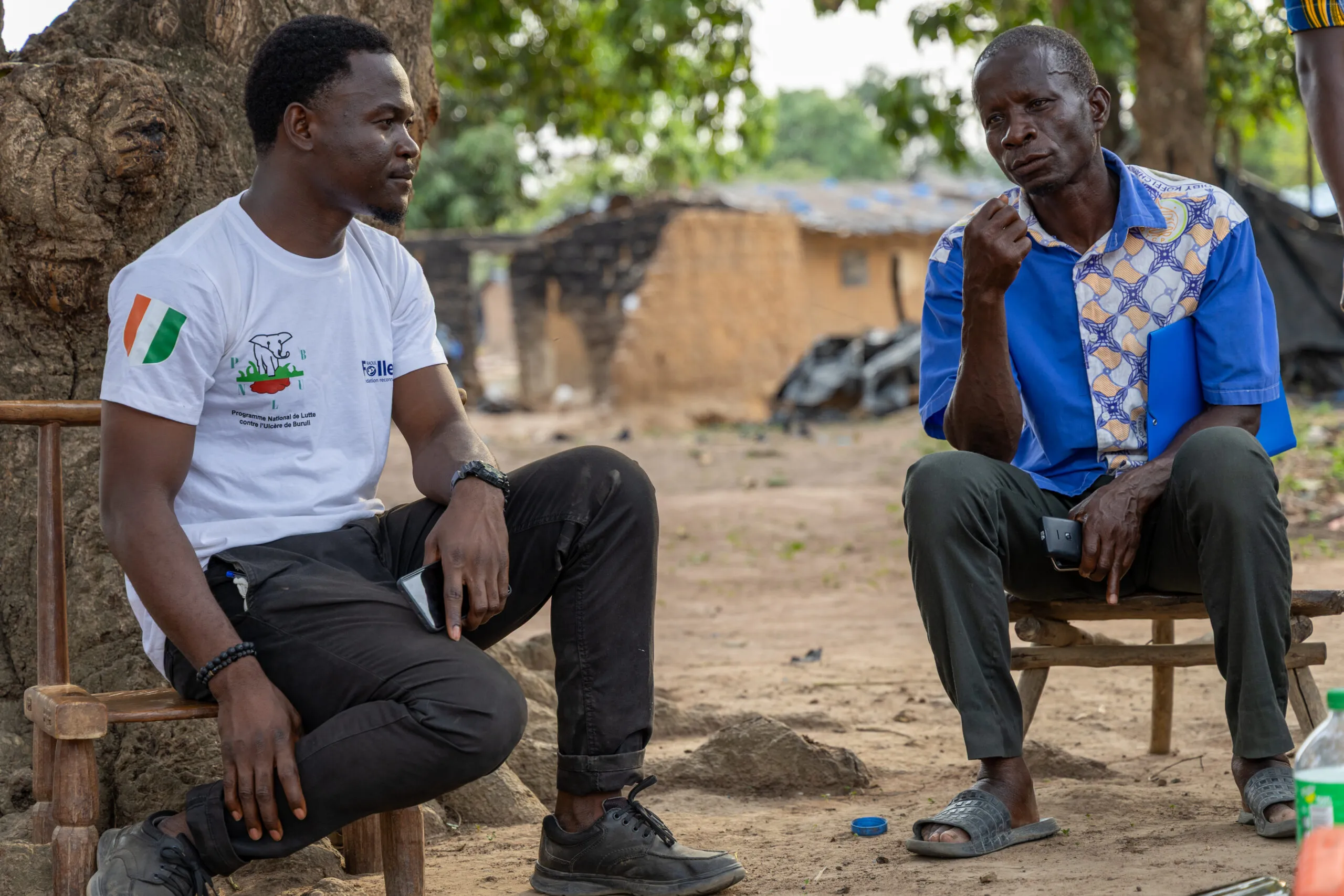 Rassemblés sous un haut anacardier, les leaders de la communauté accueillent l’équipe du district sanitaire de Daloa, du Ministère de la Santé et de la Fondation Raoul Follereau. Des chaises surgissent, en plastique, en bois, aux accoudoirs gravés du nom du chef. Les salutations d’usage sont initiées par Odilon Camara, le coordonnateur adjoint du projet : « Nous voulons vous remercier et vous présenter la mission. Vous savez qu’une consultation a déjà été faite dans la communauté, nous venons aujourd’hui pour réaliser la mission de dépistage auprès des écoliers et écouter vos besoins. » Les hommes se concertent, à voix basse, et le chef – fondateur du village – accepte la mission du jour.