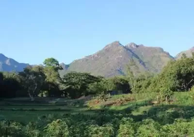 Aux portes de Fort-Dauphin, le centre d’Ampasy est entouré de montagnes. En arrirèe-plan, la case en bois où vit le père de Sonia. ©Marie-Capucine Gaitte